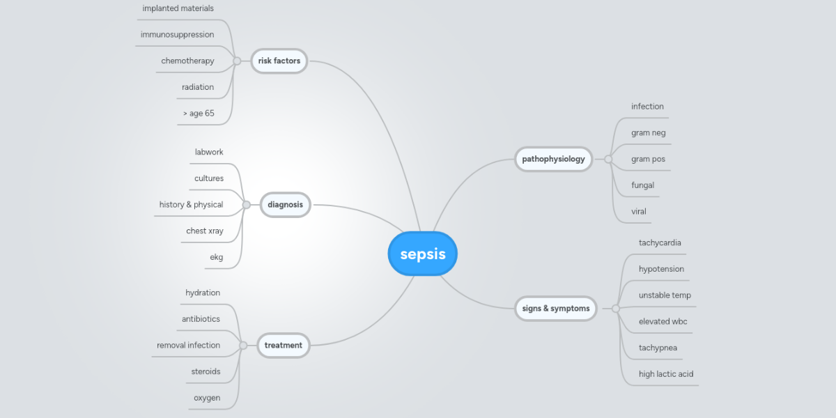 Ok additional information included in a concept map is commonly patient education and significant labwork. So in this circle here lets add important patient education information including teaching the patient and family about treatment modalities, what to expect while hospitalized, and ways to prevent future sepsis.