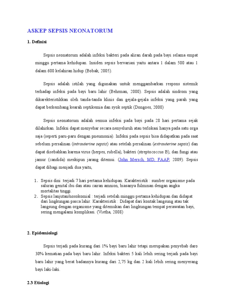 Sepsis pada neonatus (sepsis neonatal) titut s pusponegoro sepsis neonatal adalah sindrom klinik penyakit sistemik, disertai bakteremia yang terjadi pada bayi dalam satu bulan pertama kehidupan. Sepsis pada bayi baru lahir merupakan salah satu penyebab kematian utama pada bayi.